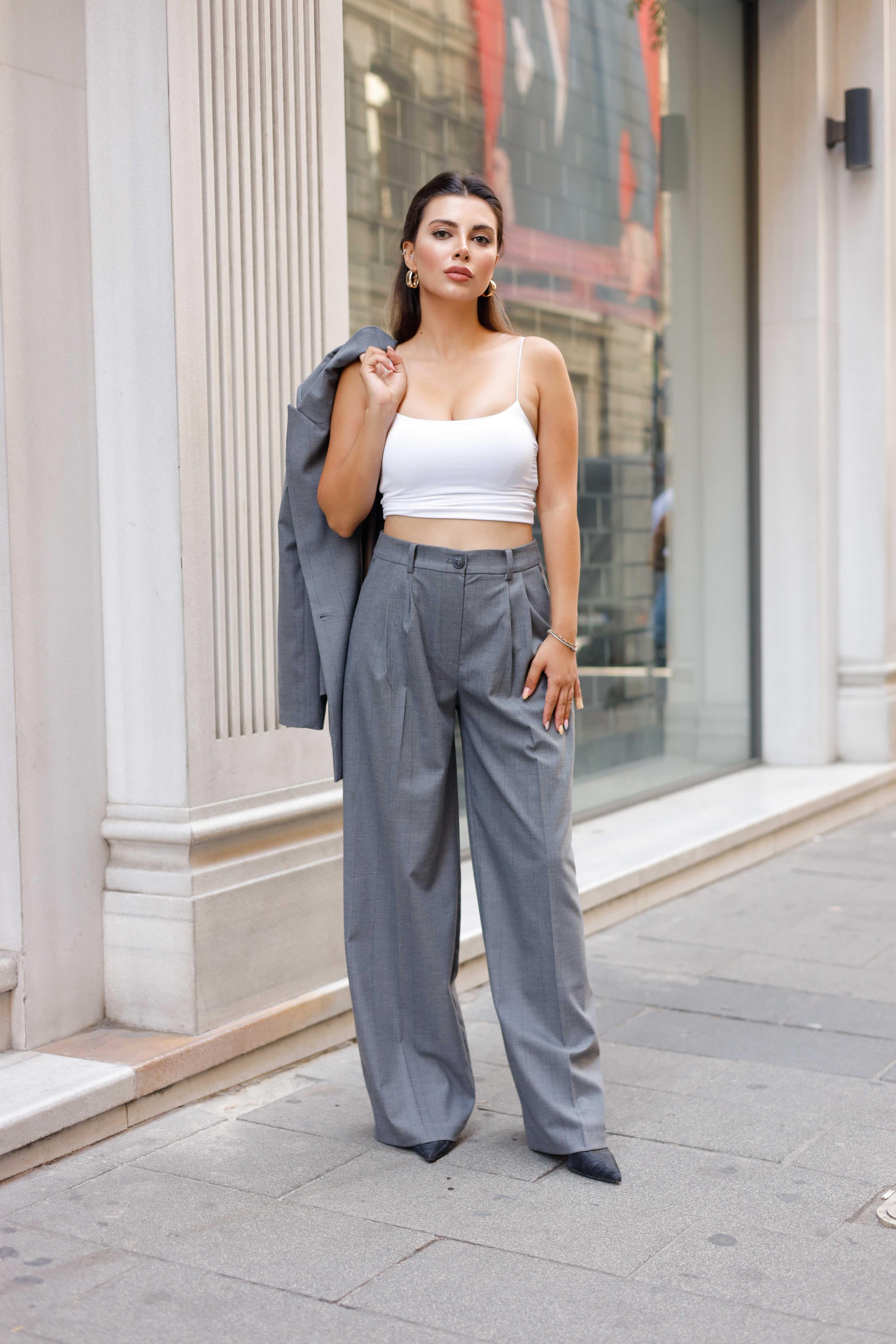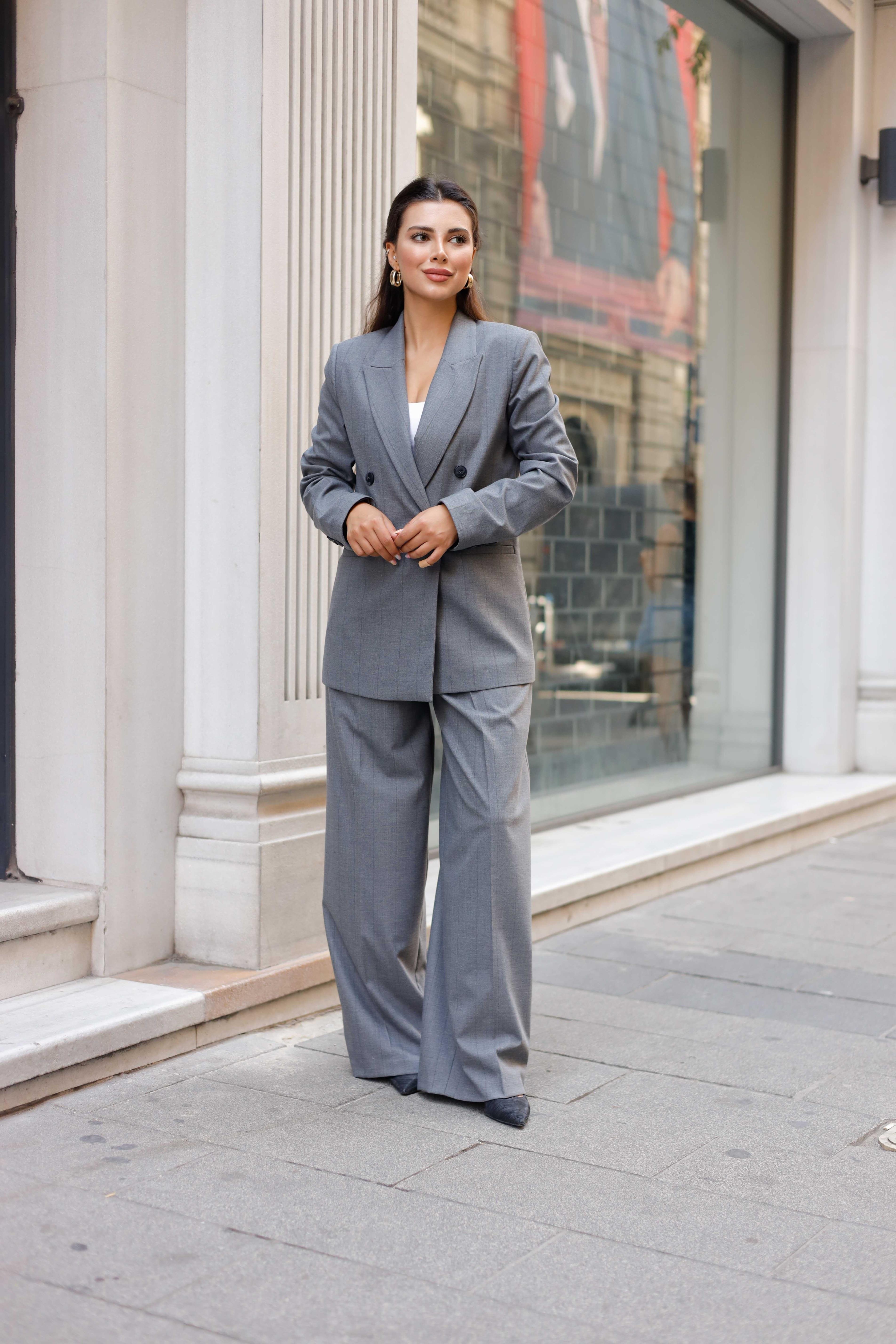 4 Düğmeli Kruvaze Geniş Çizgili Takım Gri (856)